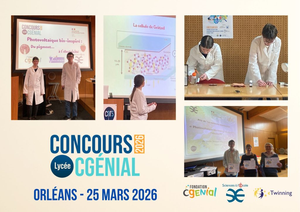Le mercredi 25 mars 2026, deux projets du lycée, inscrits au concours CGénial 2026, ont été invités à présenter leurs travaux à la finale académique qui se déroulait à la délégation du CNRS d’Orléans la Source. Le projet « Photovoltaïque bio-inspiré : du pigment à l’électricité » réalisé par Lénaïg VERMERSCH (508) et Loïs NICOLAS (508) et […]